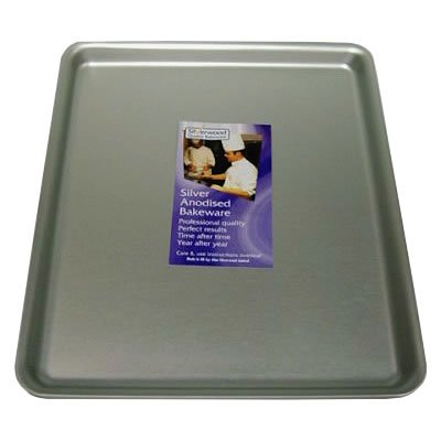 Roasting tray in heavy silver-anodised aluminium - Alan Silverwood''s bakeware is our fastest selling. Aside from a comprehensive range, it''s superior performance has won it many loyal followers amongst home bakers and caterers. Silver-anodising is a process that permanently seals in the aluminium and produces a product that is an excellent heat conductor with an easy-release surface.Practically, this makes it rust-free, easy-to-use and results in shorter cooking times.In particular, pastry tends to be crisper due to the heat retention of the product.If anything does stick to an item, a quick soaking will sort it out.Not to be used in the dishwasher as the surface will discolour.